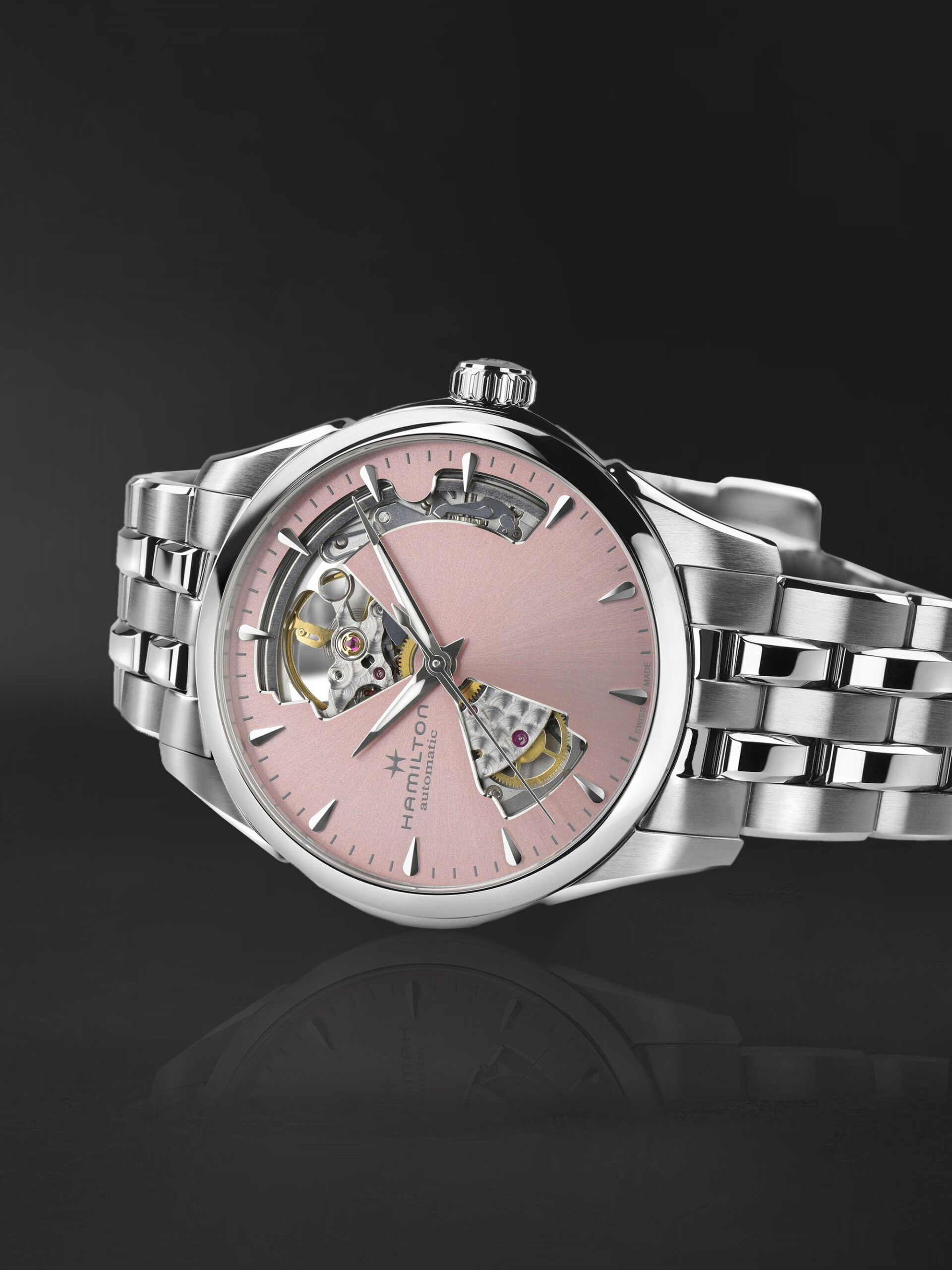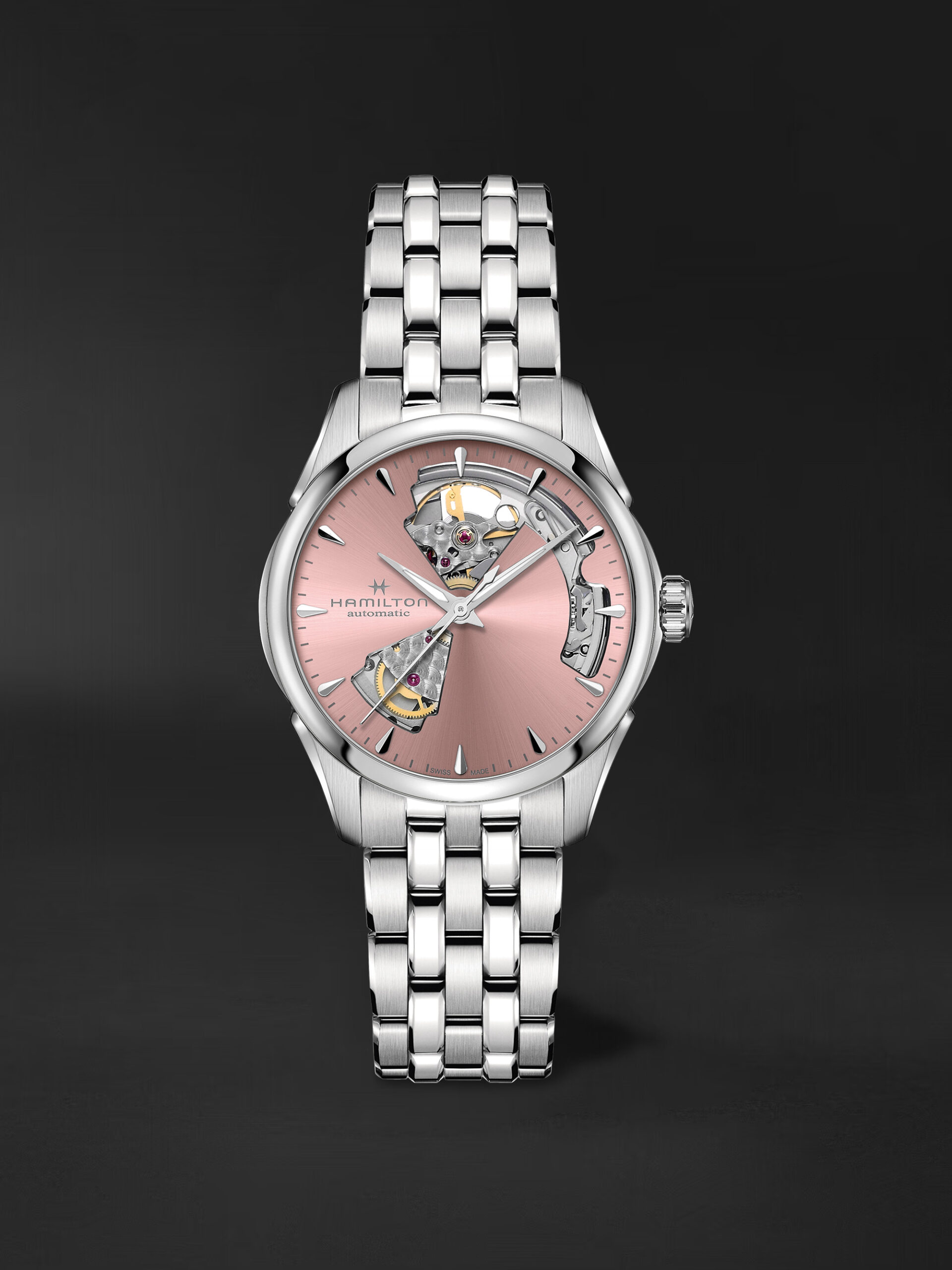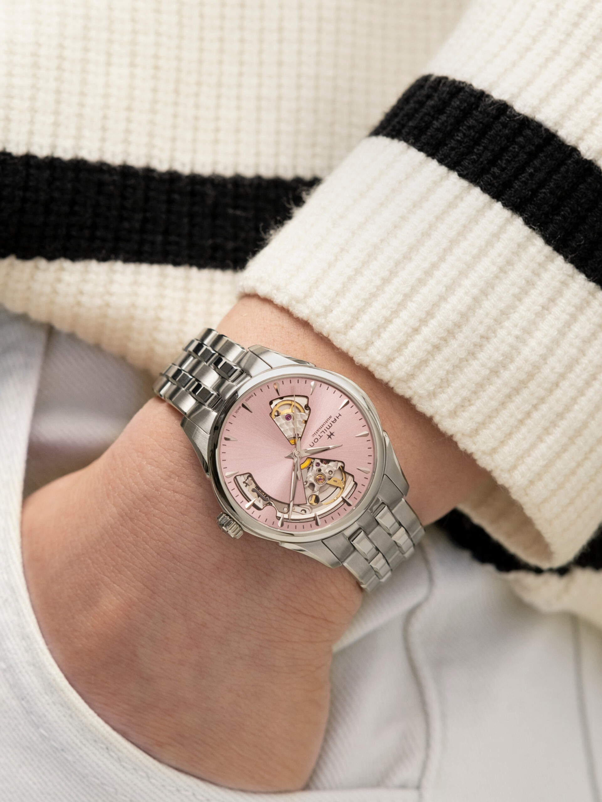 36 mm’lik Jazzmaster Open Heart klasik görünümle yenilikçi işçilik arasında mükemmel bir denge kurar. Yeni açmış çiçeklerin tazeliğinden ilham alan bu paslanmaz çelik versiyon, feminen bir çekicilik ve çarpıcı bir stil için narin bir pembeye bürünmüş pencereli bir kadran tasarımına sahiptir.